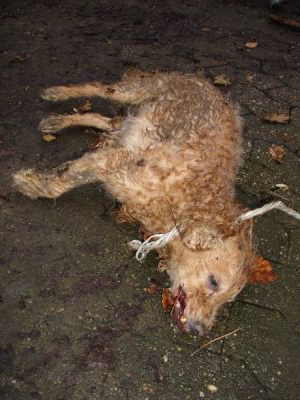 Dieser Hund wurde erdrosselt im Hackenbroicher Waldstück gefunden am 05.01.08. Sachdienliche Hinweise bitte an das Tierheim Dormagen www.tierheim-dormagen.de |