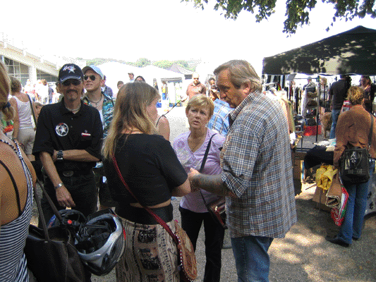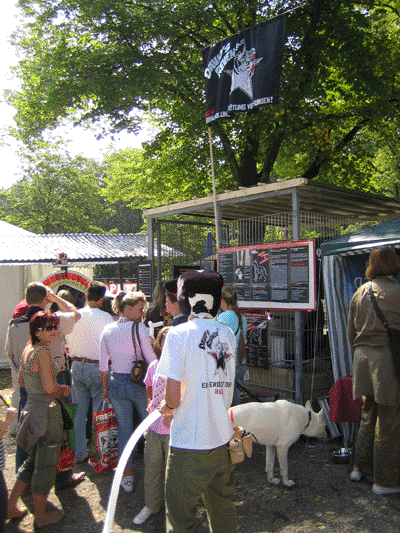 David als Walkact, der Kindern Luftballonhunde knotet Klein eng und aus Stahl wie die Käfige der Hunde in der Beschlagnahmung in den Niederlanden, mussten sich die Gäste an der Verkaufstheke entlangdrängen. Mit einem winzigen Unterschied. Auf dem gesamten Dog Day, in engster Gesellschaft von unzähligen Hunden (Listen- und Nichtlistenhunden) gab es nicht das kleinste Bisschen Aggression oder eine Beißerei. Wie kann das nur? Oder kann es daran liegen, dass alle Besucher sehr gut drauf waren und fröhlich. Und sich das auch auf alle Hunde übertragen hat? Noch nicht bis in die Niederlande zu sehen, aber weit über dem Stand wehte unsere Fahne. Als Zeichen unseres Widerstandes gegen Misshandlungund die Tötung von Hunden. Wir danken den Initiatoren des Dog Days und allen Interessierten Besuchern für die wichtigen und guten Gespräche an unserem Stand. Und dem unermüdlichen David, der trotz der Sonne und Hitze unter der Maske Luftballonhunde knotete, bis seine Finger wund waren. So wund wie die Liegestellen der Hunde in den Laser-Asiels, die dort auf hartem Boden ohne Decken liegen müssen. Der Mensch unter der Davidmaske, (Johannes Hawranek). Dir nochmal unser Dank für Dein unermüdliches Engagement. Und das obwohl er nicht einmal einen Hund irgendeiner Rasse besitzt. Die Schlange am Glücksrad zur symbolischen Befreiung der Stoffhunde aus den Käfigen reißt nicht ab. Unser Dank an alle, die um die süßen Hunde mitgekämpft haben. Wir konnten einige befreien. Weitere werden bald im Shop zu kaufen und symbolisch zu befreien sein. Danke an die reizende Dame am Glücksrad, Bernadette Hoffmeister, die kaum Zeit hatte einen Kaffee zu trinken, weil sich bei ihr alles unermüdlich um die Befreiung der Hunde drehte. Danke an alle Kinder, die hier für die Hunde kämpfen und manchmal ihr Letztes gegeben haben. Auch ihr letztes Geld. Für diese Generationen lohnt es sich weiter zu kämpfen. Sie haben es auch verdient Hunde aller Rassen kennen zu lernen. Danke an unseren Besuch aus den Niederlanden. Die dort eine sehr sehr sinnvolle Arbeit leisten. Und deren Beispiel wir folgen wollen. Wir haben in Euch Freunde gefunden. Ebenso unser großer Dank an alle Sponsoren, die durch den Kauf unserer Artikel zu unserer finanziellen Unterstützung beigetragen haben. Die Marke wächst so langsam auch optisch immer weiter. Mein Ganz besonderer Dank an Gerard Kuiper und seine Frau sowie seine Familie, die unseren Stand sowohl besucht, als auch den ganzen Tag durch ihr Wissen und gute Gespräche sachlich und fachlich fundiert bereichert haben. Ebenso unersetzlich, Guido Giesieck (links im Bild mit der Davids Revenge Kappe). Ohne ihn wäre der Auf- und Abbbau des Standes unmöglich so schnell gegangen. Seine nicht endenden Ideen für Branding und Promotion haben letztlich auch dazu beigetragen, dass der Stand so gut besucht war, wir hier zu ahnen ist. |