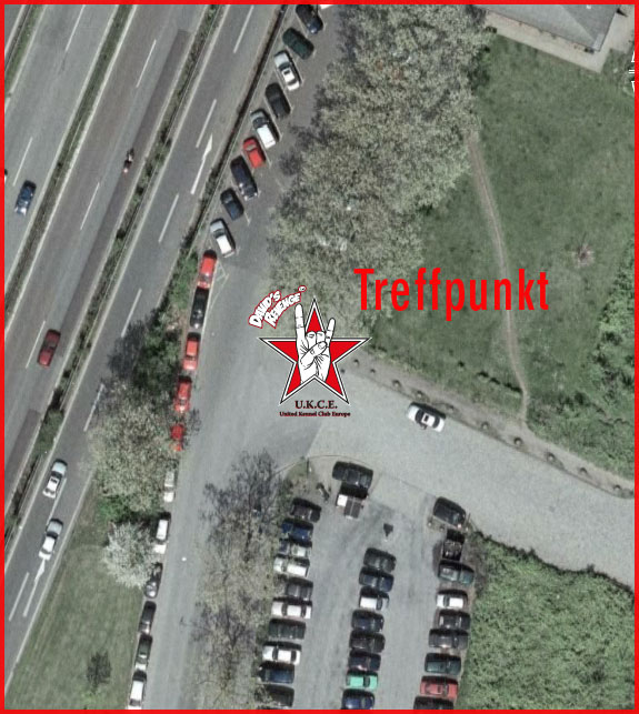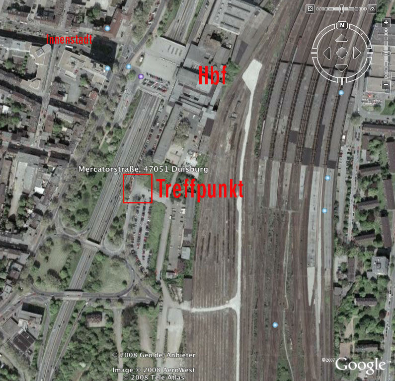 kommt Ihr aus dem Bahnhof. dann geht Ihr links Richtung Süden entlang der Straße bis zu dem Eingang des Tagesparkplatzes. Hier werden wir uns in Duisburg treffen. Es besteht die Möglichkeit auf diesem Parkplatz eigene nicht benötigte Autos für 3 Euro den ganzen Tag dort zu parken.